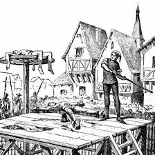 Also known as the Breaking Wheel. The condemned were placed on a cartwheel with their limbs stretched out along the spokes over two sturdy wooden beams. The wheel was made to revolve slowly, and a large hammer or an iron bar was then applied to the limb over the gap between the beams, breaking the bones. This process was repeated several times per limb. Afterwards, the condemned's shattered limbs were woven ('braiden') through the spokes of the wheel, which was then hoisted onto a tall pole so that birds could eat the sometimes still-living individual.